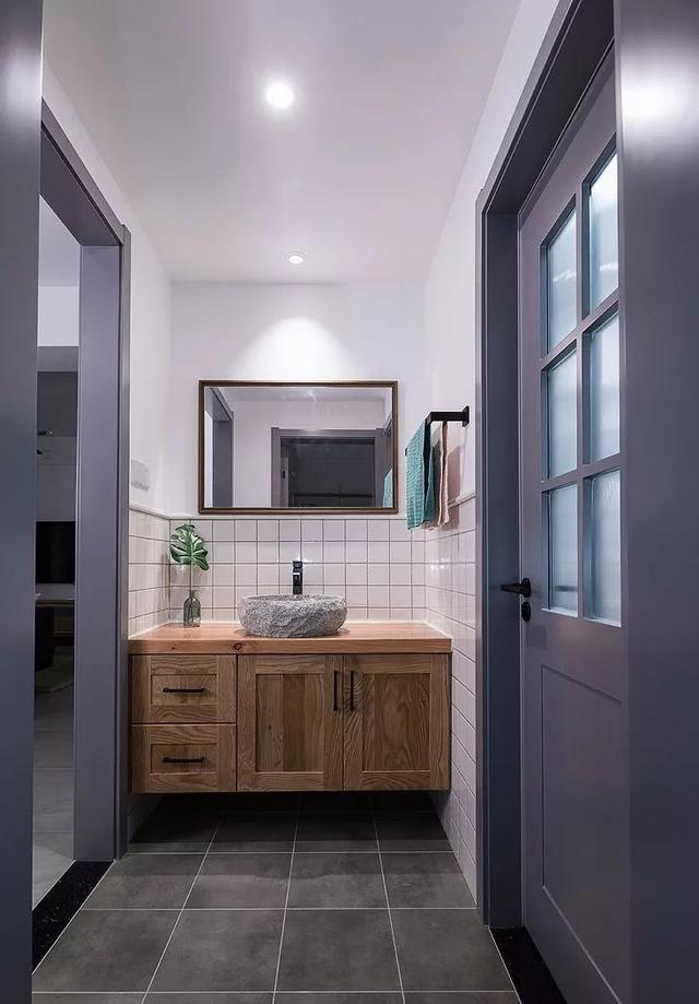 ▲ 卫生间采用干湿分离的设计,干区台盆柜的柜体是木工现场打的,台面用的是一整块的实木,墙砖贴半腰高就好,层次感更强。
