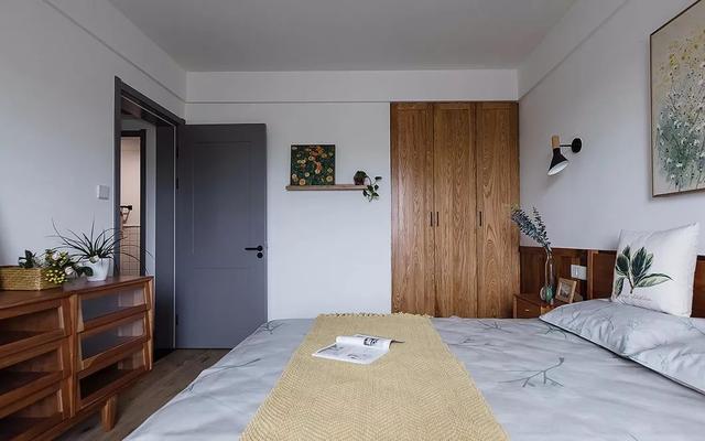 ▲ 主卧大面积的木色与白色搭配,简约自然。空间多处采用绿植进行点缀,生机满满。