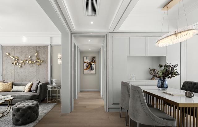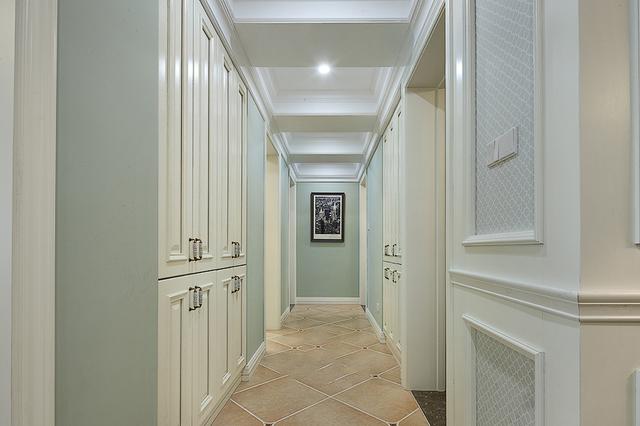 过道的尽头除了可以挂画以外,如果有空间的话,你还可以定制一个柜子,柜子的颜色尽量选浅色的,比如白色的柜子,视觉上也不会显得拥挤,同时又可以增加很多储物空间!