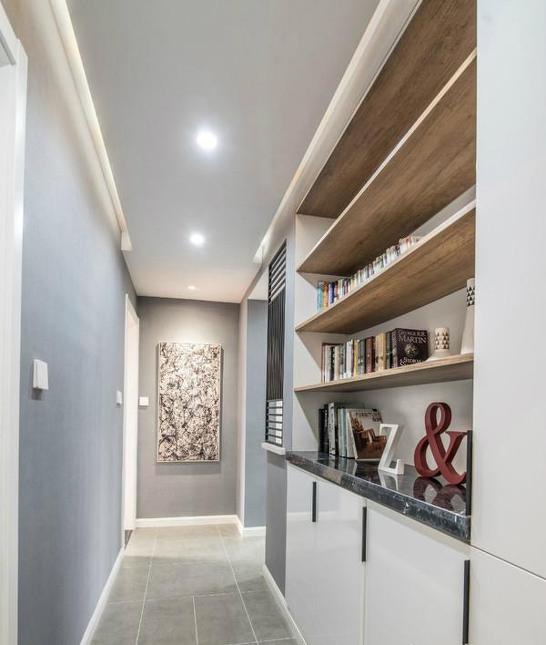 如果你家过道的空间足够宽,大概有1300mm以上宽度,可以做一个300-350mm的深度的书柜,书柜采用无门板设计,可以更加节省空间,另外如果你不想定制开放式书柜的话,直接买几块隔板装在墙上,也可以当当书架使用。