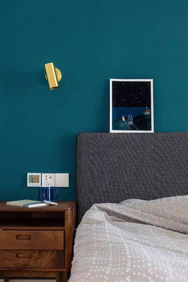 可以调节角度的个性灯饰,实用且富有个性。胡桃木床边柜、强化地板铺贴、海军蓝的背景墙,一切的软装都配合的那么默契,自然而然流露出精致的生活气质。