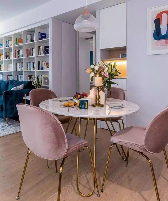 整体空间格局上更加适合圆桌,屋主比较好客,经常有客人拜访,圆桌更加方便增加位置招待客人,一群人围在一起吃火锅超级有氛围!大理石桌面的圆桌搭配着粉色丝绒餐椅不经意间流露出了轻奢的氛围。