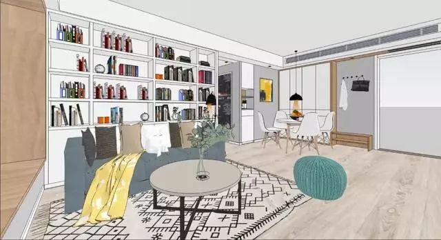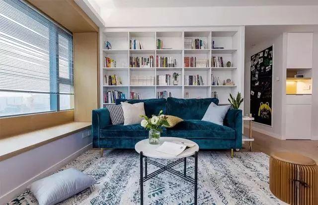 4. 客厅沙发后面布置了书柜,同时将柜体延伸至飘窗,增加零食柜空间。