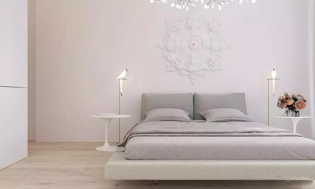 纯白的卧室,去除了生活中的繁杂,墙面石膏板雕花设计,为极简的空间带来优雅的情调。