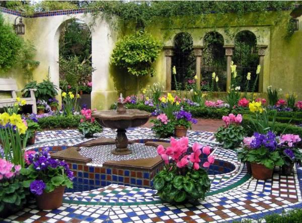 地中海式庭院是两方面因素的结合,其一是不加修饰的天然风格;其二是对色彩、形状的细微感受。虽然总体是不规则风格,但是庭院中的每个元素都是经过认真考虑之后才加以使用的,特点是休闲舒适。