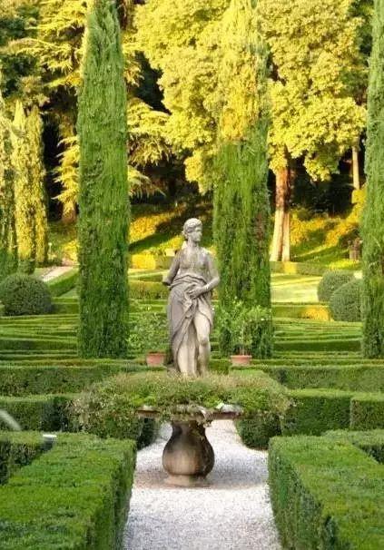 采用规划式布局,在沿山坡引出的一条中轴线上,开辟了层层台地、喷泉、雕像等,植物采用黄杨或柏树组成花纹图案树坛,突出常绿树而少用鲜花。庭院对水的处理极为重视,借地形台阶修成渠道,高处汇聚水源引放而下,形成层层下跌的水瀑,利用高低不同的落差压力,形成了各种同形状的喷泉,呈塔状,或将雕像安装在墙面,形成壁泉。作为装饰点缀的小品形式多样,有雕镂精致的石栏杆、石坛罐、碑铭,以及古典神话为题材的大理石雕像等,从而形成了很有自己风格的意大利台地式园林。