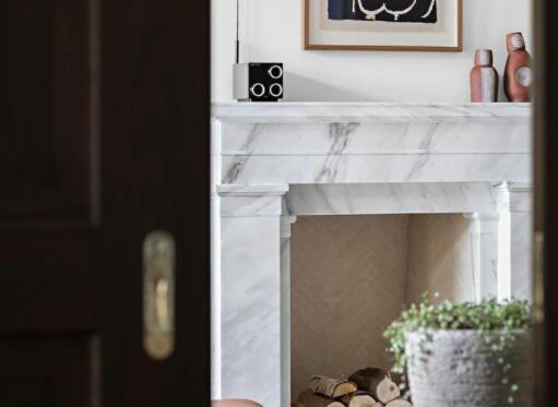 进门便是一处壁炉,大理石的光滑釉面配上装饰画,文艺气息十足。