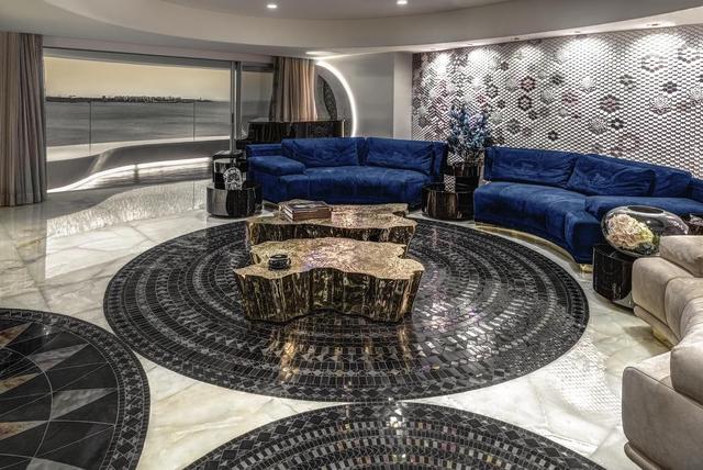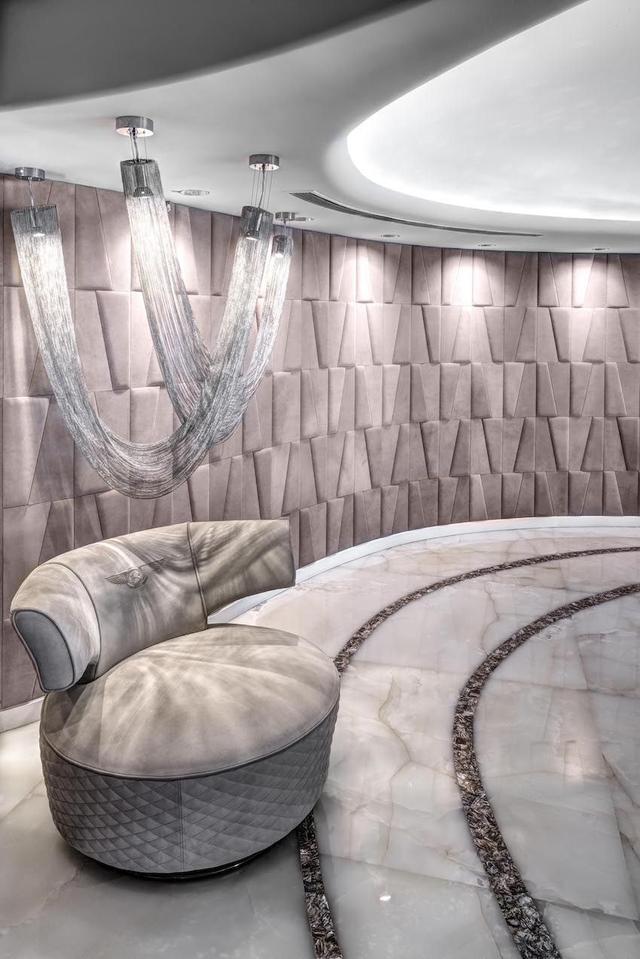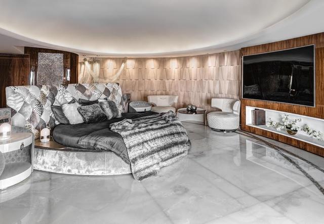 在主卧室是完全专注于无与伦比的景色之外的宏伟空间。床是房间中的焦点,床的方向应使其与电视成一个角度且与另一个窗口相对。在这间卧室的设计中,空间被完全重组为圆形,而没有通常定义的方形房间,大理石地板强调了这一点,周围环绕着环形镶嵌物。房间完全面向豪华和舒适环境,一侧设有座椅,搁板空间,内置床头柜和辅助床头柜。一侧的弧形墙具有填充和簇绒的几何设计,增加了柔和的触感并有助于吸收更多声音。