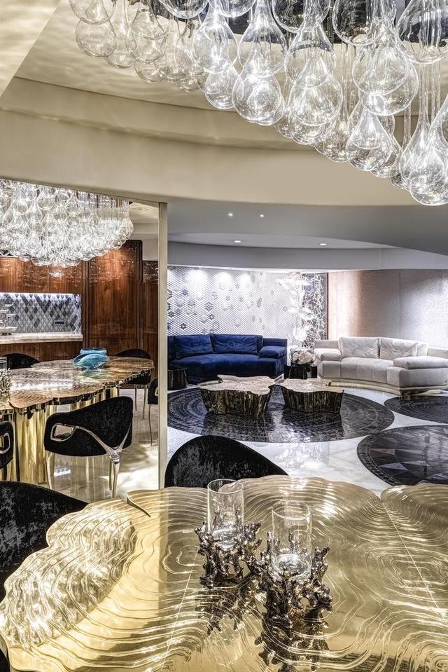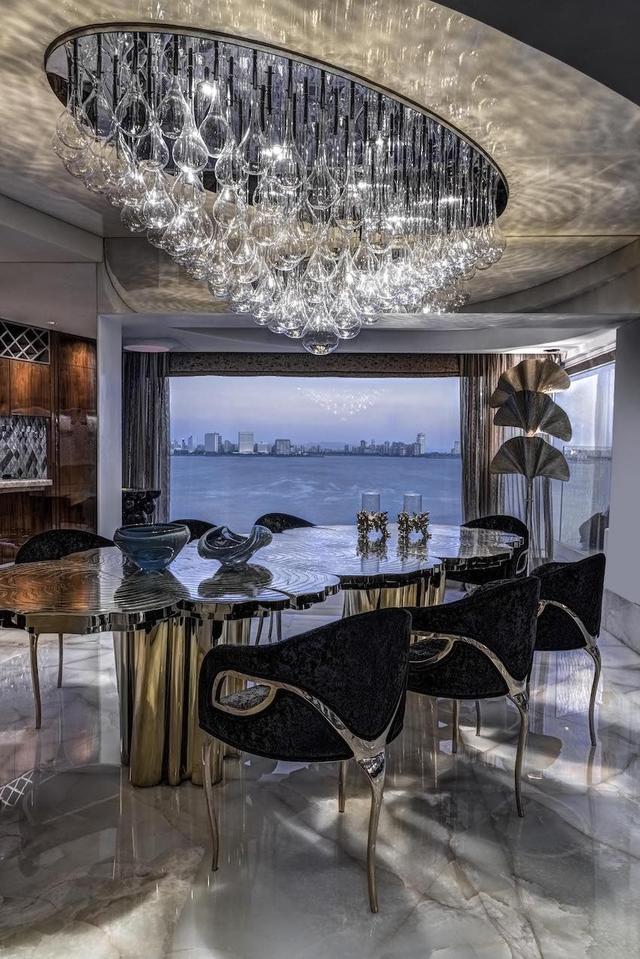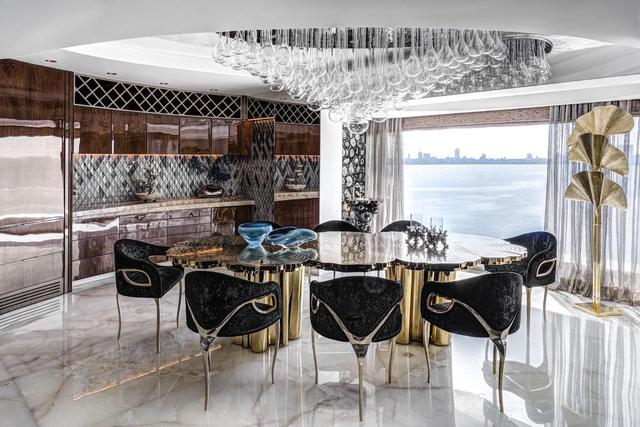 主要生活空间的自由流动曲线延伸到餐厅。重新设计了该空间中的窗户,使其具有无缝玻璃,从而可以一览无余。此外,设计人员还竭尽全力来制作大型超大窗户,使框架最少,从而进一步保留了视野。此外,天花板和结构梁的天花板都很低,这些梁经过巧妙地伪装,可以使空间感觉开阔而亲密。Boca do Lobo的黄铜Fortuna餐桌强调了通风和光泽的内部效果,搭配定制的枝形吊灯drat可以吸引人眼球,而不会分散视线。大型有机形状桌子与KOKET雅致的Chandra餐椅搭配将现代魅力与复古魅力融为一体。