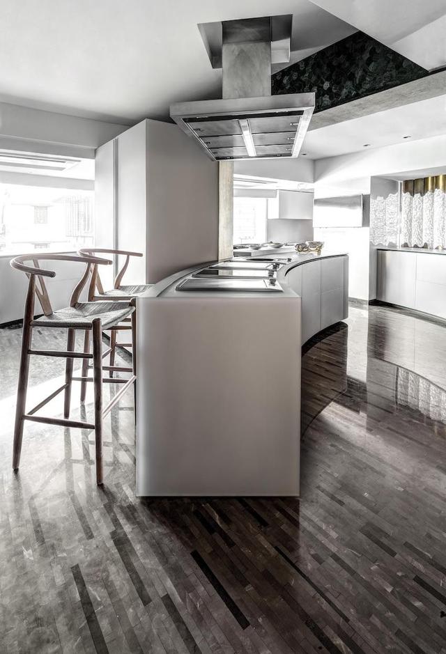 厨房的形状像一个开放的胶囊,其弯曲的柜台围绕着由磨砂玻璃制成的弧形中央岛。调色板将白色橱柜和柜台与灰色阴影的图案墙和大理石条纹地板相结合。当然,厨房配备了所有需要的最先进的设备,所有设备都被精心隐藏起来,直到需要使用为止。沿着柜台,Koket的Charla Dining Chair吧椅版本采用了灰色纺织面料,与墙壁相协调,并在空间中提供了柔软的质感。