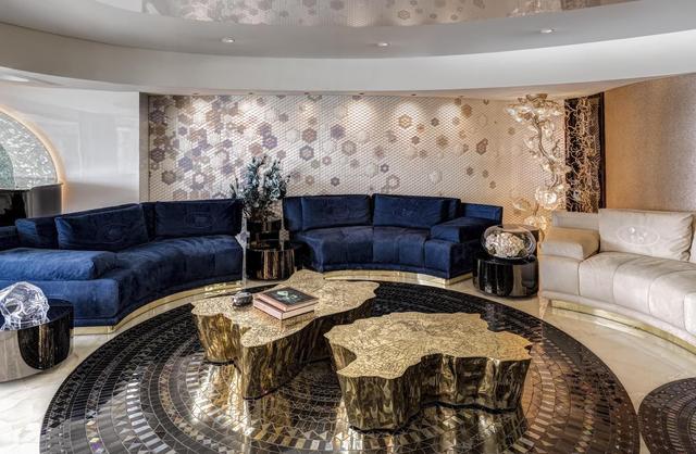 在开放式的空间,本质上是一个网格布局,但是,设计师们能够将其改造成一个家庭充满了蜿蜒的曲线和意想不到的建筑和设计特点。通风,开放的起居室是各种质地,质地和颜色的混合物,经过精心整理后,构成了分类。弯曲的沙发有助于在地板上形成令人惊叹的中央图案,并带有一点装饰艺术感。沙发后面的特征墙上的几何图案与落地灯和Boca Do Lobo的伊甸茶几的有机线条更加僵化。它旨在呈现知识树的一部分,唤起有关欲望诞生的故事。由抛光的铸造黄铜制成,顶部刻有模拟树木的环和心的图案。