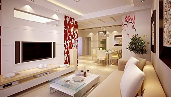 客厅应是整个居室,无论是自然采光还是人工采光中亮的一个,如果觉得整体甚是单调,可以在墙面上,或是电视墙上修饰写别的色彩,比如热情的红色,那觉得可以让整个客厅“活”起来,充满着跳跃感。