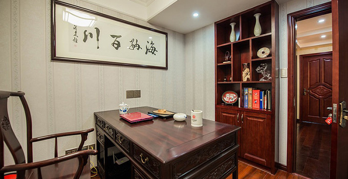 在中式书房内的装饰上,往往采用碧纱橱、屏风、竹帘、帷幕等物,以增加其美感、静趣、雅风。中式书房的家具若全盘收用于现代居家,也许会过于沉重,但有选择使用,利用一些软装饰,如淡色的抱枕、桌巾或窗帘,便能让空间展现宁静氛围。