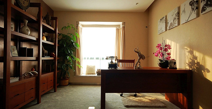 现代家居若受空间条件所限,无法开足够大的窗子,那么在灯光照明上,也要缜密考虑,必须保证有充足且舒适的光源。此外,精致的盆栽也是书房中不可忽略的装饰细节。绿色植物不仅让空间富有生命力,对于长时间思考的人来说,也有助于舒缓精神。都市人愈来愈希望自己时尚简约的家中也能有古色古香的书房,而中式书房的家具,大致包括:书桌、书柜、椅子、书案、榻、案桌、博古柜、花几、字画、笔架、笔筒及文房四宝等,其中有些是中式书房必备的要件。