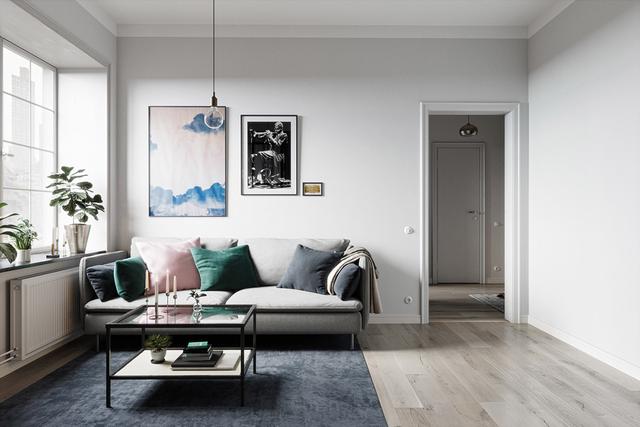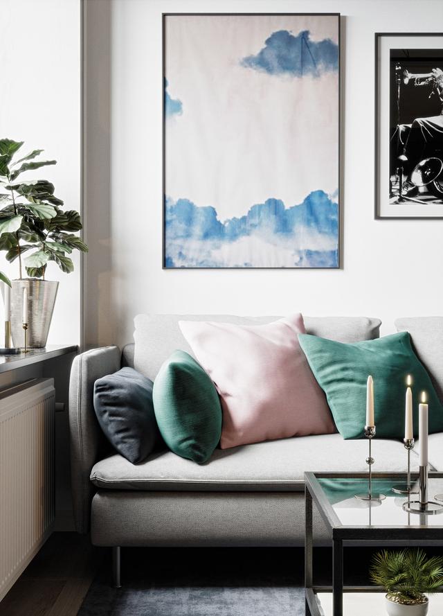 粉色和绿色的散置靠垫,柔和的彩色墙面艺术,将色彩引入第二个家居空间中的客厅。