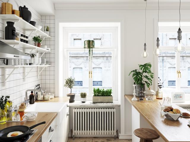 丰富的绿色植物提升了灰色和白色的一面墙厨房的外观。