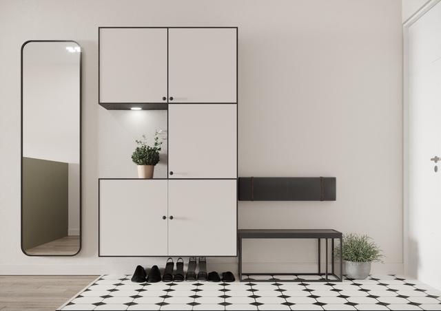 黑色和白色的瓷砖铺满了家庭入口的地板。黑色座椅的靠背与底座分离,并与墙壁相连,让人有一种定制的感觉。单色墙柜被安排在一个向后的“c”形,这形成了一个理想的书架室内植物在中心角落;一个单独的LED聚光灯照亮了它的叶子。