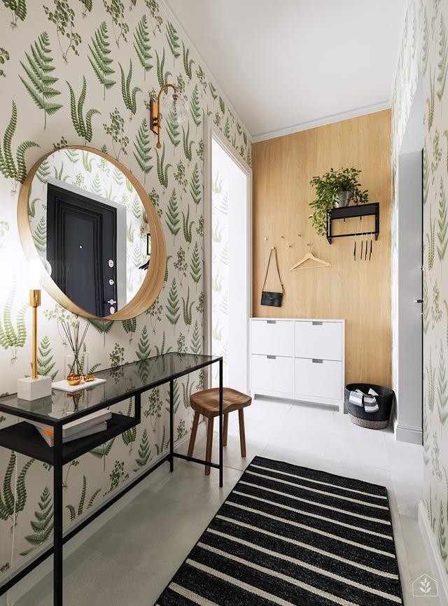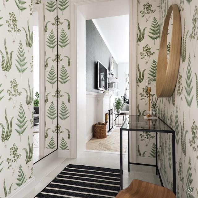 植物主题壁纸以异想天开的叶子印花覆盖走廊。