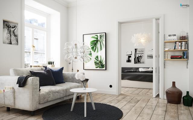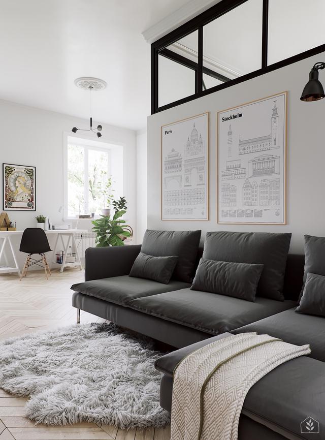 在白色的客厅点缀着黑色的配件重量增加了光线和通风的美感。