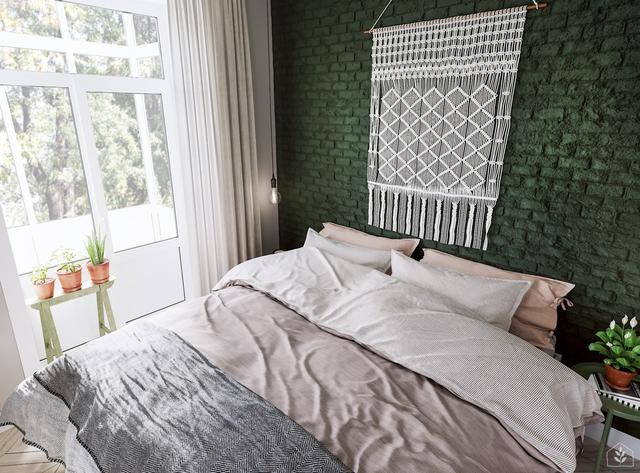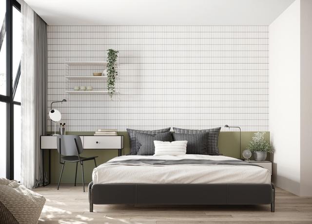 在极简主义的卧室里,有一个宽阔的绿色床头板设计,也跨越了家庭办公区后面的空间。