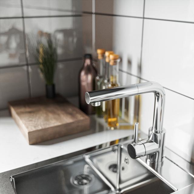 柔和的绿色厨房被一端的玻璃门激活。厨房地面覆盖着与家庭入口相同的黑白地砖,以实现一个有凝聚力的室内设计。