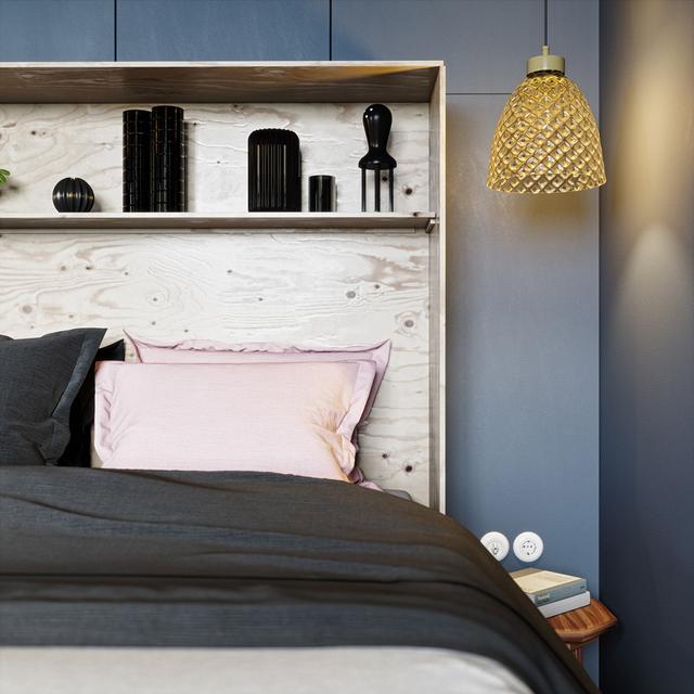 在清晰的体积内,蓝色的卧室方案拥有舒适温馨的外观。蕾丝纱线柔化了玻璃隔断的视觉效果。