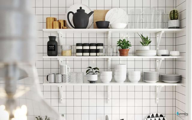 在一些开放式厨房搁架上的陶器中出现了更多的植物。