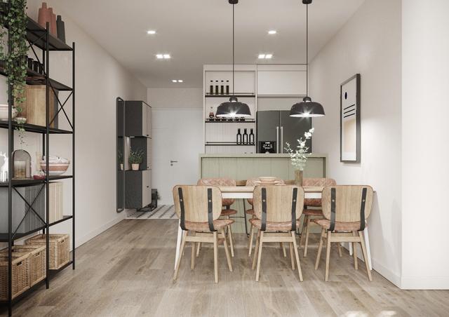 两盏黑色的餐厅吊灯挂在一张木制餐桌上方。绿色的条形图给场景增添了色彩。