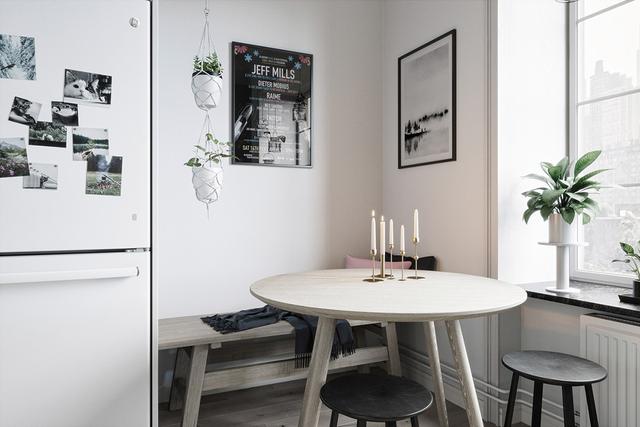 第三个家居案例的起居室配有美丽的植物艺术印花。整洁的木质餐桌上摆放着一些奇特的动物雕像。