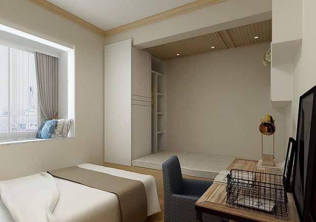 武汉家装公司:整个原木色系的空间使用蓝色窗帘拉开层次感,柔和而时尚。错落式电视墙增加了空间的整体跳跃感,让空间不再单调。以简洁的表现形式来满足人们对空间环境感性和理性的需求,简洁明快,以少胜多,以简胜繁。