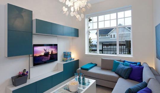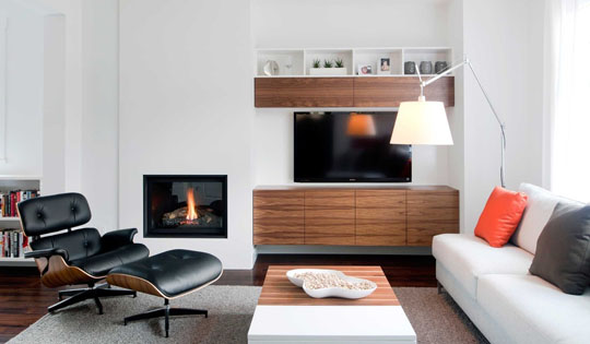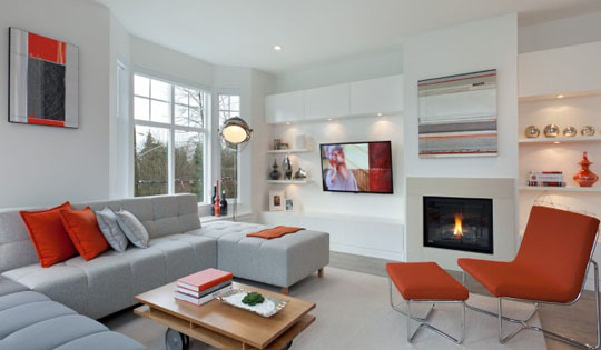 编辑点评:悬挂的电视机节省空间,使电视主墙质感更加轻盈。采用多个陈列架装饰电视背景墙不仅美观大方,还提高空间的收纳功能。橙色的靠垫与单人椅,也白色空间碰撞出色彩活力。