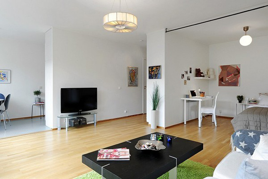 编辑点评:功能区“一体化”的44平公寓仅仅靠2堵墙作隔断,错落的隔断墙设计不仅有效实现了分区,还增强了敞亮的空间层次感和灵动性。