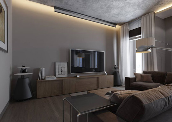 编辑点评:透明玻璃落地窗配上垂地式白色窗帘,不仅增加空间的采光率,还与整体空间的灰色色调相和谐。复式吊顶回光灯槽在视觉上扩大了空间,达到辅助光线的作用,又给空间增添神秘浪漫感和层次感。