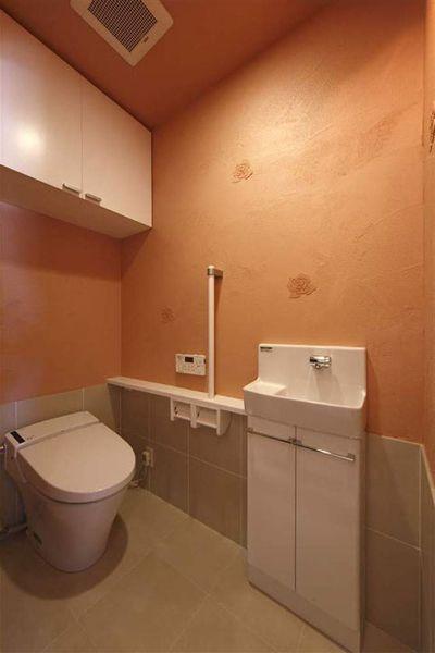卫生间的设计十分柔和,采用了橘色的硅藻土涂料粉刷墙面,墙上还贴有蔷薇雕花,淡雅柔美。采用节水型马桶,贴合了屋主环保低碳的要求。