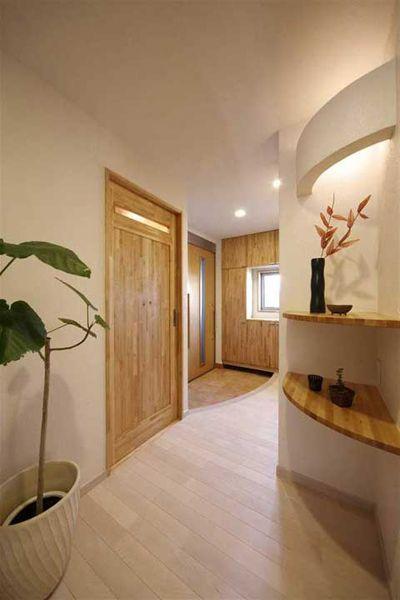 玄关处设计得清新淡雅,原木材质的木门和地板相互辉映,角落处摆放着盆栽和插画,为这个空间增添一缕恬淡的生活气息。