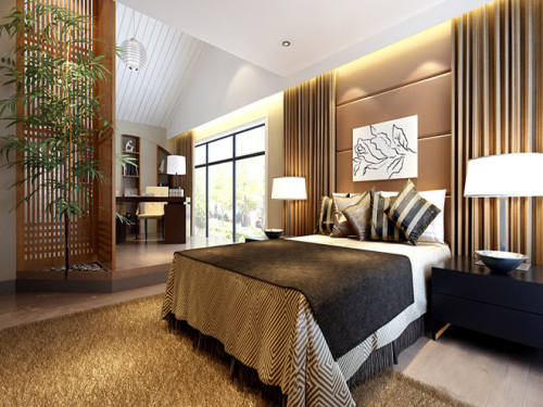 卧室的设计通过大量的木质家具和少量的盆栽体现清新舒适!自然