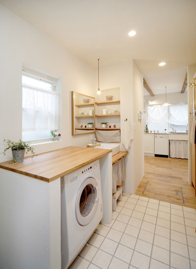 装饰Tips:洗漱区域,同样充满了淡淡的日式风情,木色的桌板,白色的墙壁,将洗衣机放在里面,不仅节约了空间,而且非常实用。白色小窗帘遮住了一部分的窗户,窗外若隐若现的景色,给生活增添了一抹神秘感。再搭配绿叶植物,清新亮丽的色彩将洗漱间装饰的更加亮丽简洁。