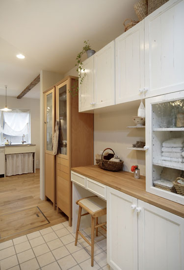 装饰Tips:洗漱间的外侧,白色与木色打造的收纳柜子非常实用,收纳柜子贯穿整面墙壁,各种物品分门别类的摆放,不仅整齐,而且干净大方,尽显淳朴的日食风情。透明的玻璃柜子中,整齐的摆放上毛巾等各种洗漱用品,不仅可以避免沾染灰尘,而且赶紧整齐。竹制手工编制的小篮子,装入女主人的各种化妆用品,弄弄的复古气息飘散整个空间。