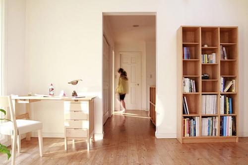 书桌和书柜都是木质板材打造,造型十分简洁,墙面的留白也是一种极简的艺术。