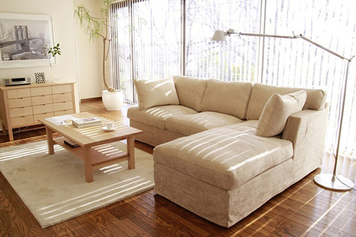 米色、白色、原木色的搭配和简单低矮的家具来营造宽敞明亮的简约氛围。