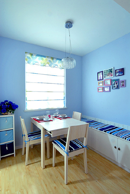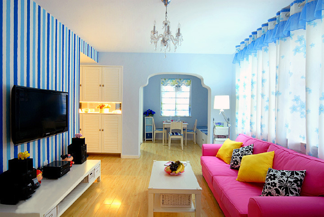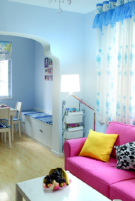 这是一个童话般的色彩家,很温暖很惬意。房间面积很小,但房主对色彩具有极高的敏感和迷恋。清爽的蓝色壁纸搭配粉色的布艺沙发还有柠檬黄的靠垫,色调搭配的鲜美宜人。漂亮的窗帘和屋子的整体色调融合起来。雅致的浅蓝色,柔和的光感仿佛置身于仙境一般。