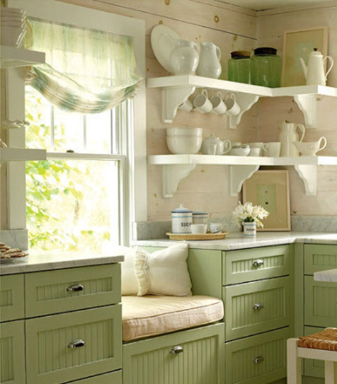 厨房的一角采用绿色的橱柜来同这个现代简约风格装修相一致。多层次的隔板设置方便收纳更多的厨房用具。