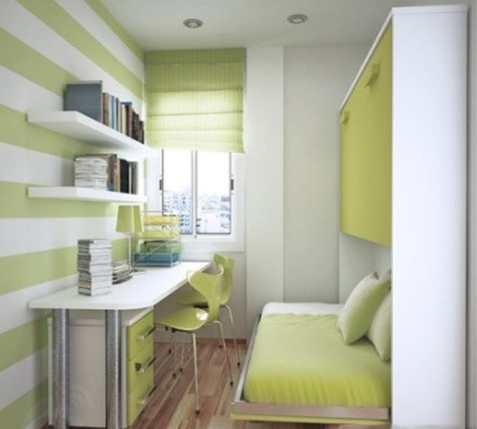 次卧的空间狭窄,设计师更多的将垂直空间进行利用。巧妙的设计让视野空间更加开阔,绿色的装饰让人身心放松。