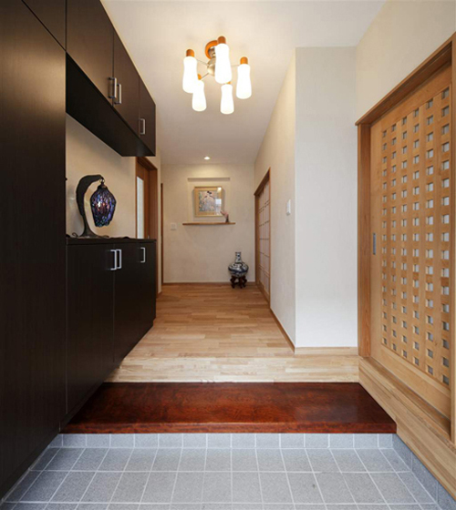 装饰Tips:黑色木质的鞋柜,贯穿整面墙壁,摆放上一家人的鞋子,尽显整洁大方。木质镂空的拉门,复古的样式,给整个空间吹来浓郁的日式风情。造型独特的一盏台灯,给主人生活带来不一样的品位。