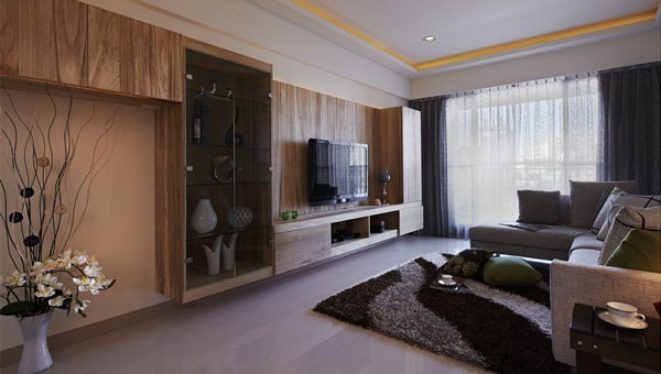 传统的日式家居将自然界的材质大量运用于居室的装修、装饰中,不推崇豪华、金碧辉煌,以淡雅节制、深邃禅意为境界,重视实际功能。灰色麻布的窗帘,灰色的沙发,搭配木色的电视墙,复古的色彩更加亲近自然。摆放上一些小饰品,不仅起到了装饰作用,而且增加了立体感。