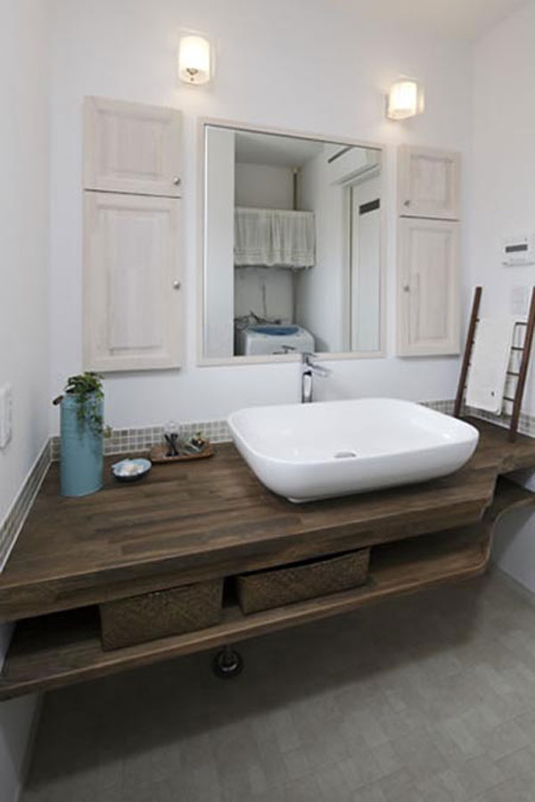 日式风格装饰Tips:木纹斑驳的洗脸台,做旧的样式,带来了一抹复古气息。一面长方形的镜子,不仅可以供主人整理穿戴,还起到了扩大空间的视觉效果。