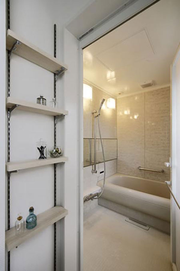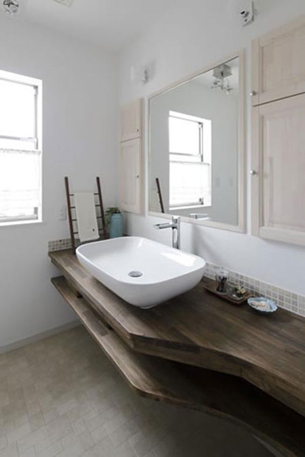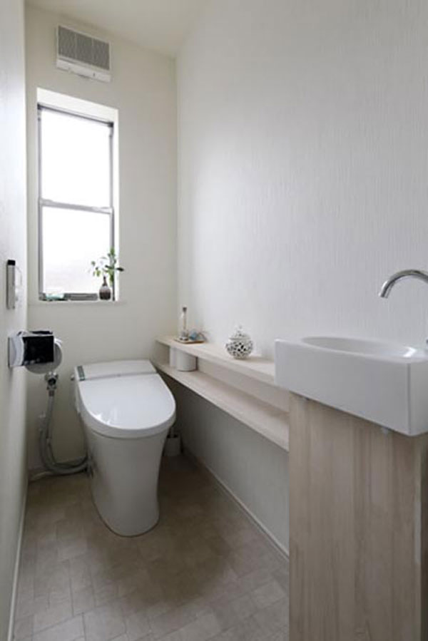 日式风格装饰Tips:卫生间的墙壁用了硅藻土,具有除臭和调节湿气的作用。木板打造的收纳架,坚固耐用,放上厕纸等正好合适。样式独特的洗脸台,引人眼球。