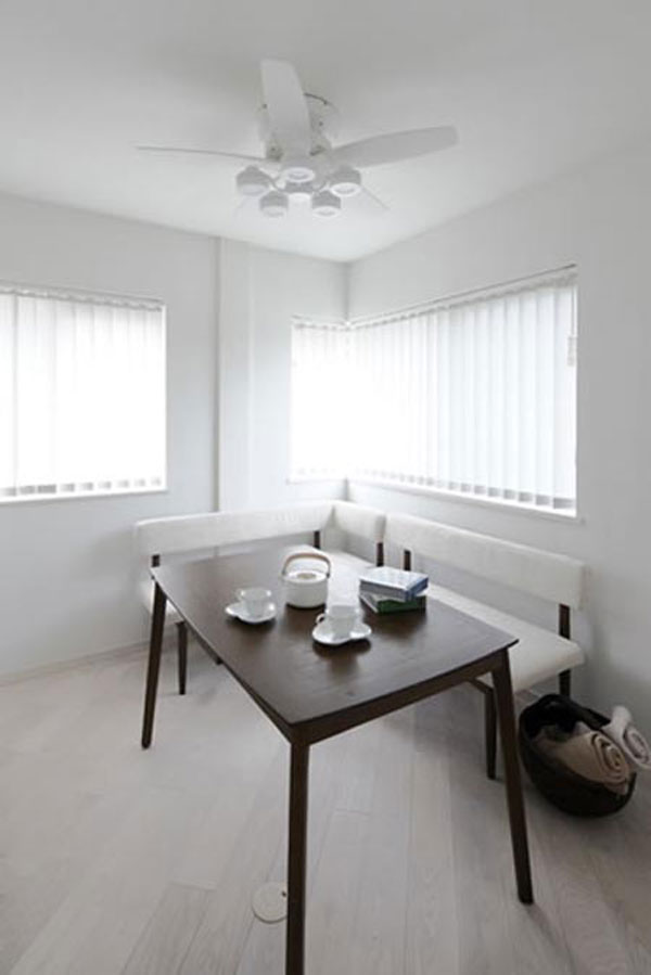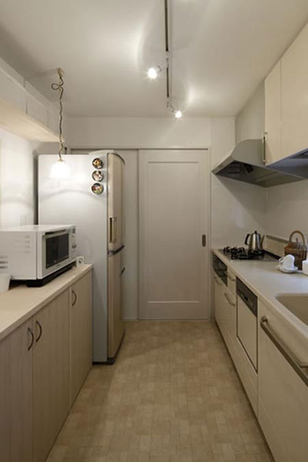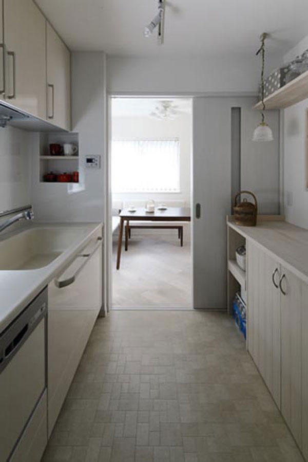 日式风格装饰Tips:灶台下方的拉式收纳柜,不仅具有防尘作用,还使得餐具的摆放更显整齐。悬空式的收纳柜,非常节省空间。室内的窗户,使得空气更加流通。