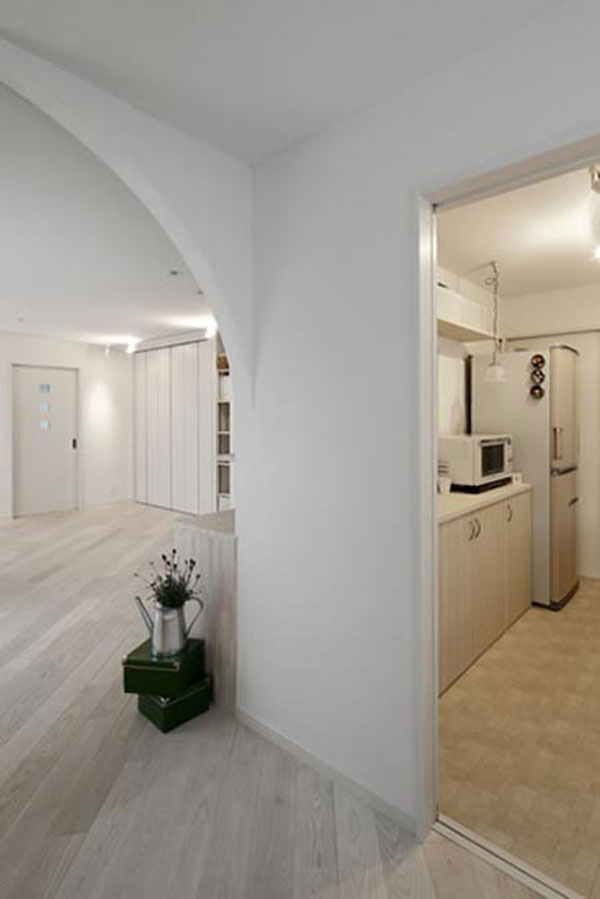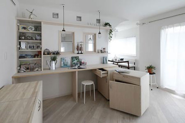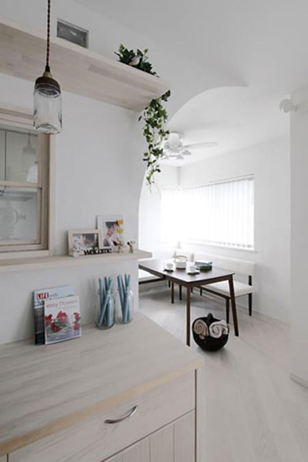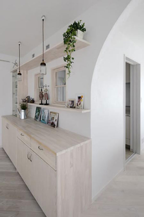 日式风格装饰Tips:拱形的入口,带着些地中海风格,使得空间更显柔和。分层的木质收纳架,摆放上相框等,使得居家环境更显温馨。下方的木质收纳柜,具有强大的收纳功能。