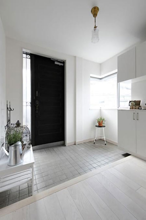 日式风格装饰Tips:淡灰色网格式瓷砖搭配木质的地板,整体显得非常协调。白色的大容量收纳柜,可以放上家中闲置的物品等,使得小家更显整洁。
